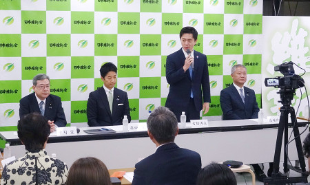 日本維新の会は19日、大阪市の党本部で常任役員会を開き、自民党との連立政権樹立に向けて協議した。反対意見は出ず、吉村洋文代表(中央右)らに対応を一任。両党は20日に政策に関する合意を交わす方向になった 【時事通信社】
