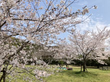 この時期は、自由広場を囲むように植えられたソメイヨシノが開花し多くの花見客でにぎわう。桜の下で食事をする家族連れや、遊具から桜を眺める人、園内を散策する人々の姿が見られる。