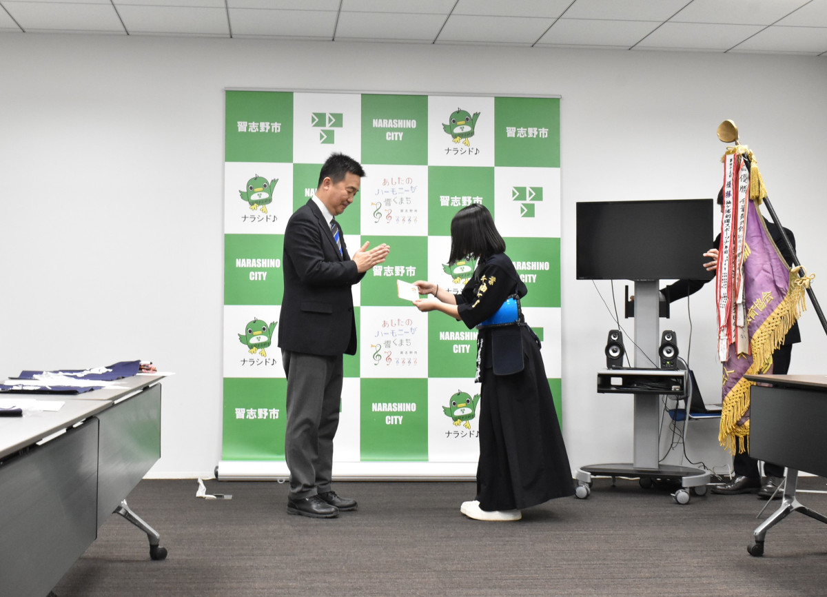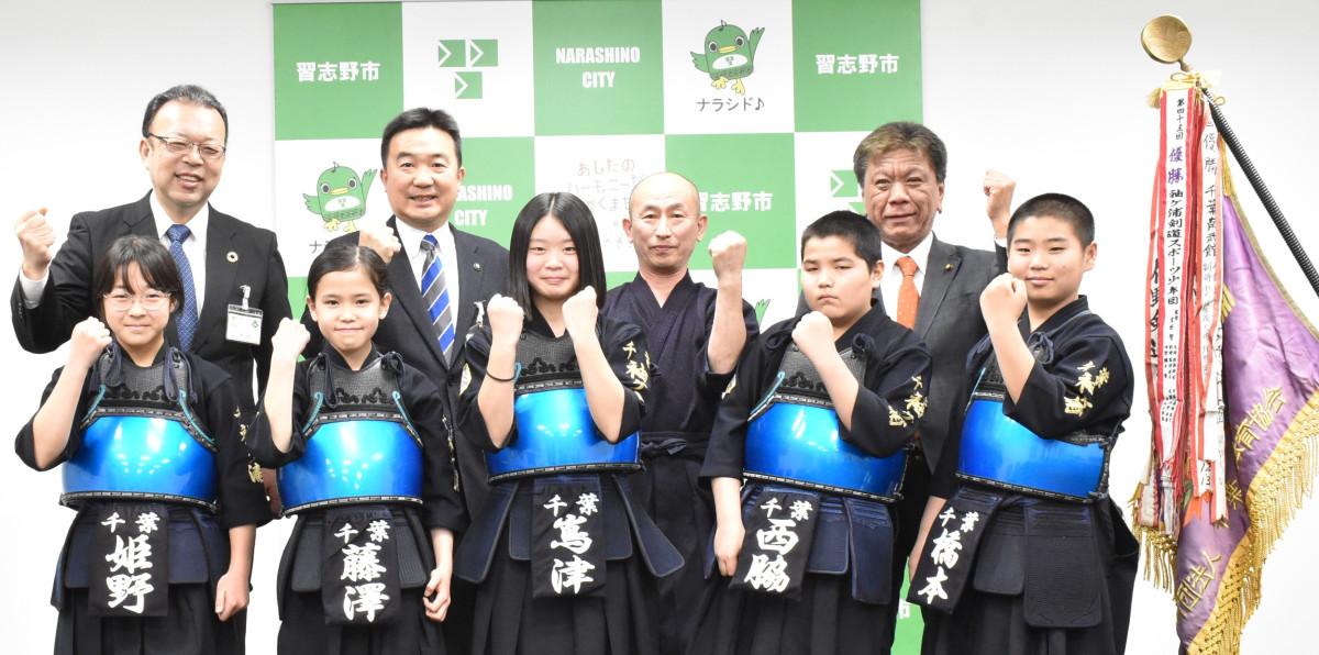 習志野市を活動拠点とする小学生剣道「袖ケ浦剣道同好会」が3月13日、全国大会予選会の団体戦で優勝し、全国大会へ出場することを市長・議長・教育長へ報告した。
