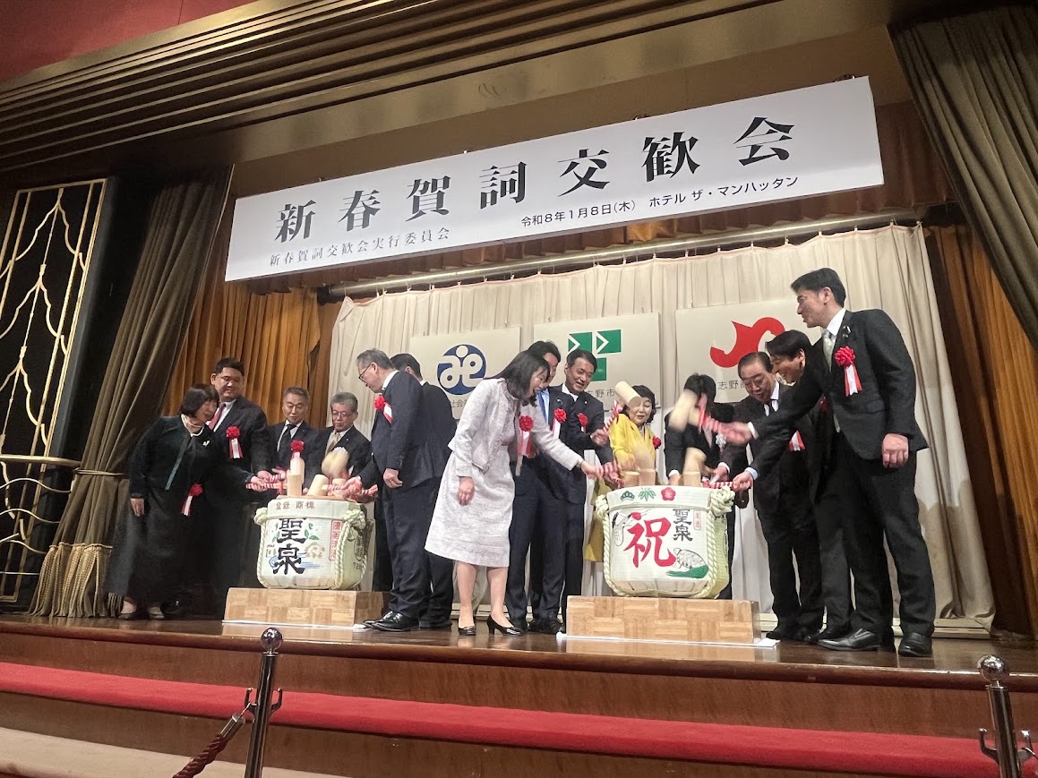 「習志野市新春賀詞交歓会」が1月8日、「ホテルザ・マンハッタン」(千葉市美浜区)で開催され、市内外で活動する関係者ら450人が一堂に会した。