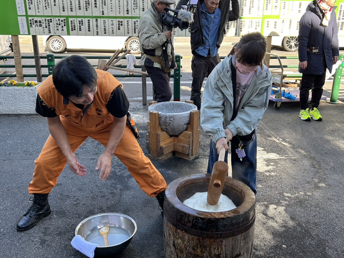 大久保駅前小公園(習志野市大久保1)で1月12日、「新春 餅つき大会」が開催された。