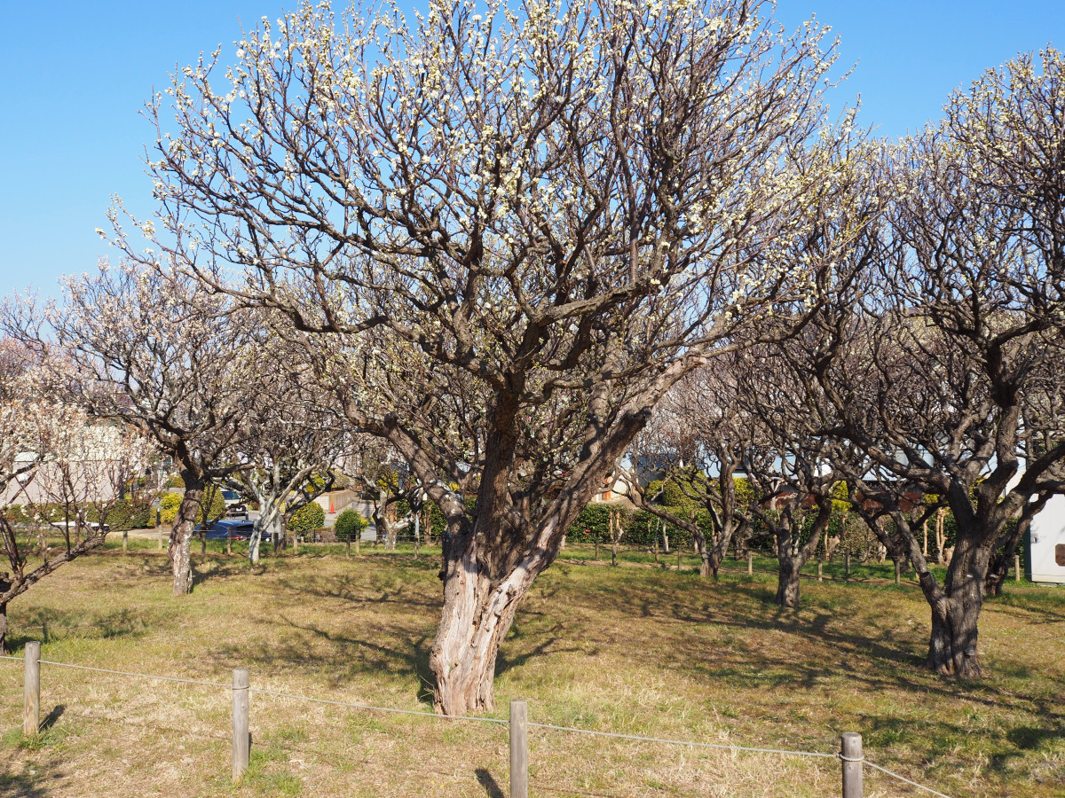 習志野の「梅林園」(習志野市鷺沼台4)で梅の花が咲き始め、春の訪れを感じさせている。