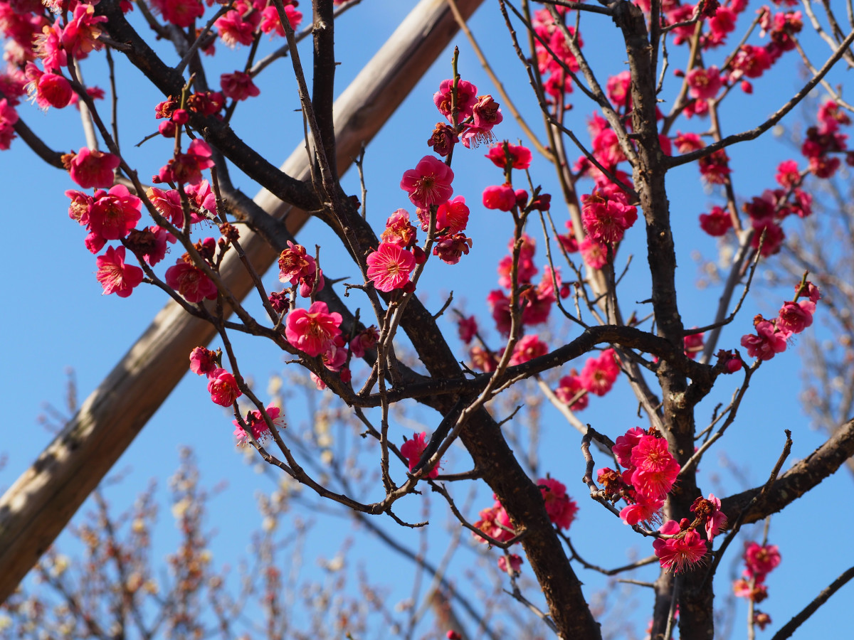 習志野の「梅林園」(習志野市鷺沼台4)で梅の花が咲き始め、春の訪れを感じさせている。