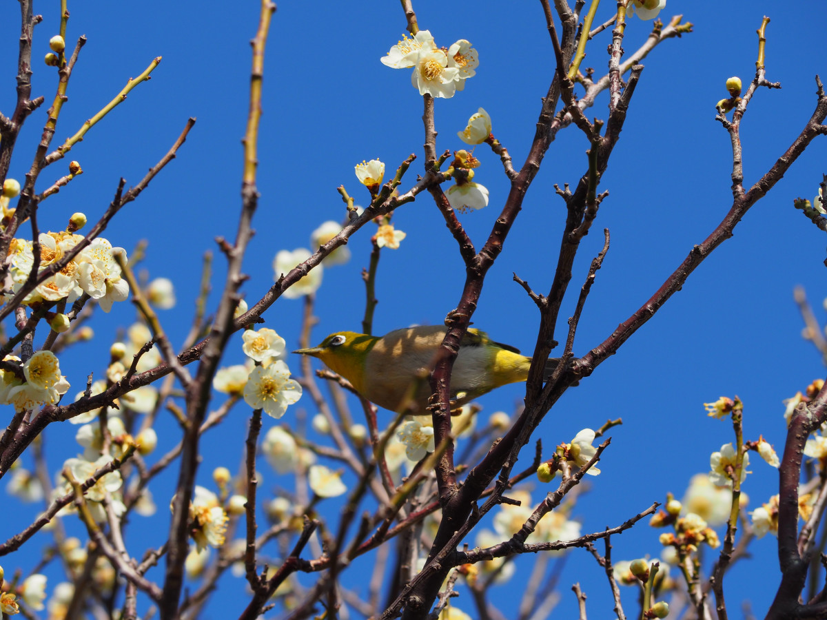 習志野・梅林園で梅が見頃に 蜜に誘われメジロも来訪