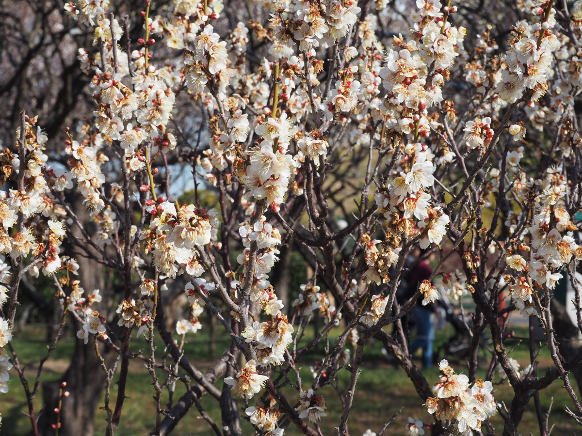 習志野の「梅林園」(習志野市鷺沼台4)で梅の花が咲き始め、春の訪れを感じさせている。