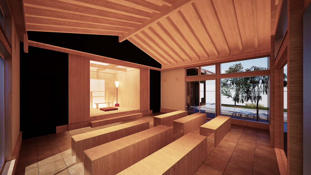 木のぬくもりを感じる祈祷(きとう)殿の内部(提供=木元洋佑建築設計室)<記事を読む>
